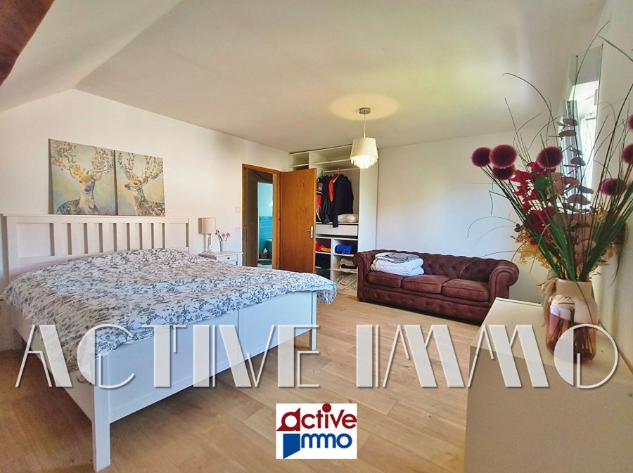 A l'étage, une vaste chambre et une salle de bain avec baignoire, douche et wc, ainsi qu'une belle pièce de 25m² faisant office de bureau et coin détente avec accès au balcon pouvant être aménagée en 4ème chambre.